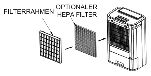 Sie können einen optionalen HEPA-Filter kaufen. HEPA-Filter verbessern die Luftqualität im Raum. Bitte installieren Sie den HEPA-Filter zwischen dem Filterrahmen und dem Lufteinlass, wie in der Abbildung oben gezeigt wird. Ersetzen Sie den HEPA-Filter alle 6 Monate oder öfter, je nach Umgebung und Luftqualität. Verwenden Sie das Gerät niemals mit verstopften Filtern.