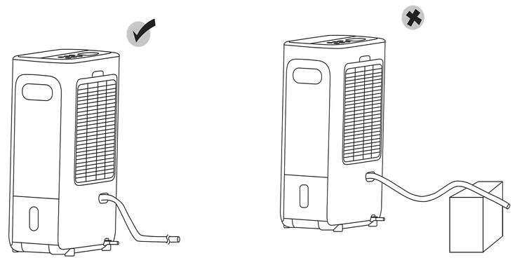 - Il tubo deve essere posizionato più in basso rispetto all’uscita di drenaggio, come mostrato nei diagrammi sottostanti. In caso contrario, l’acqua potrebbe rifluire nel serbatoio dell’acqua.